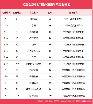 「中国大学一流専攻ランキング2025(応用型)」では、広西外国語学院の専攻が二つ5★、六つ4★、五つ3★と評価された。また、「中国大学専攻分野ランキング2025」では、1専攻A++、2専攻A+、1専攻A、5専攻B++、5専攻B+と評価され、全国の同類大学の中でも上位に位置づけられた。