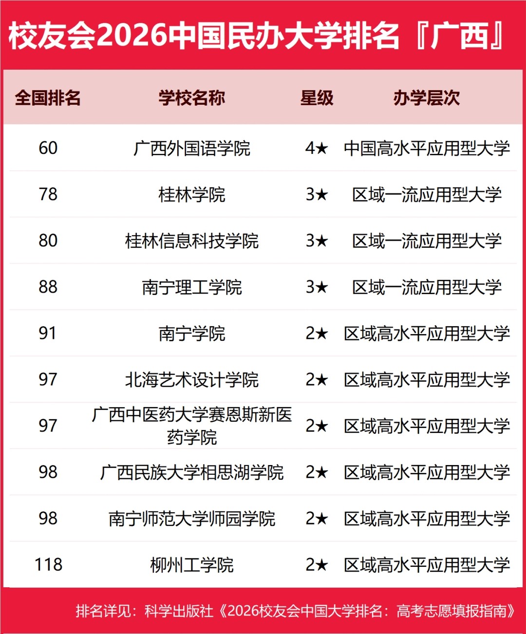 2026年版校友会中国大学ランキングが発表され、広西外国語学院は広西地区民営大学の1位を連覇し、全国民営大学ランキングでは第60位にランクインした。同大学は広西地区で唯一「中国ハイレベル応用型民営大学」に選定されている。